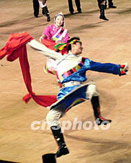 中國人民解放軍樂團八日在澳門綜藝館演出活潑歡快的藏族舞蹈。李剛 攝