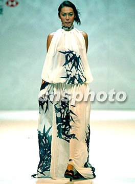 “2003香港春夏時裝節(jié)”7月10日晚舉行香港十位頂尖設(shè)計師作品展示,模特身著設(shè)計師鄧達智的一件上繪墨竹全白透明沙裙款款款而行,宛如一幅流動的中國水墨國畫。任晨鳴 攝
