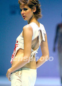 香港時裝節前日展示各款新潮流時裝,香港著名設計師鄭兆良設計的一款白色繡花女裝,體現了當今刻意追求大露背低后腰性感女裝的時尚。任晨鳴 攝