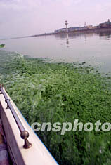昆明滇池個別水域最近綠藻泛濫,污染嚴重。快艇駛過時激起綠色的浪花,臭氣熏天。中新社記者 史利 攝