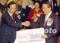 "中銀香港(控股)有限公司"7月25日成功在香港上市掛牌后,中國銀行副董事長,中銀香港(控股)有限公司、中國銀行(香港)有限公司副董事長及總裁劉金寶(右)向香港公益金籌款委員會(huì)主席柯清輝贈(zèng)送一百萬港元支票。任晨鳴 攝