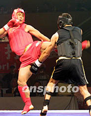 首屆世界杯武術散打賽二十五日在上海盧灣體育館拉開戰幕,中國“散打王”柳海龍首輪以二比一艱難戰勝俄羅斯選手阿土爾,晉級下一輪。圖為中國“散打王”柳海龍(紅方)在比賽中。作者:湯彥俊