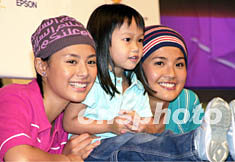 樂壇女子組合Twins兩位成員蔡卓妍(右)、鍾欣桐8日1日在香港舉行「愛上色彩之歷險」寫真集簽名會,大批Twins歌迷到場支持偶像,Twins被一位可愛的小女孩吸引合照。鄧慶樂 攝