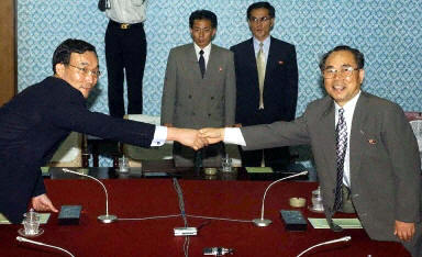 韓國與朝鮮3日下午在朝鮮金剛山旅館舉行了第七次部長級會談預備性接觸的首次全體會議,雙方著重討論了部長級會談在漢城舉行的時間和議題等問題。圖為在金剛山韓國與朝鮮的代表握手。