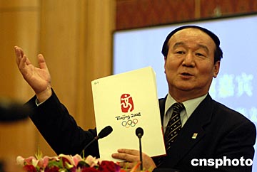 北京奧組委副主席蔣效愚二十三日在長沙“第二屆世界華文傳媒論壇”上,向與會代表展示北京2008年奧運會徽,并介紹籌備情況。中新社記者:張宇