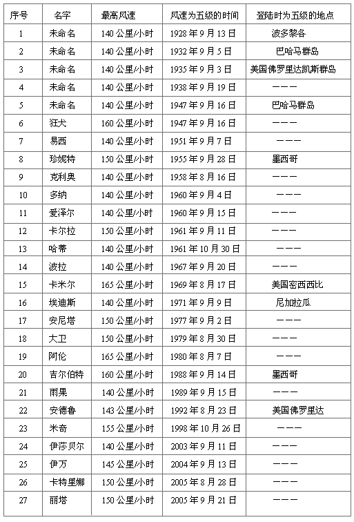大西洋史上發生颶風的次數總共是27次,只有9次登陸時風速仍然保持在五級,其中三次登陸時仍保持五級的颶風都發生在美國境內,包括1935年在佛羅里達州登陸的“凱斯”颶風、1969年襲擊密西西比的“卡米爾”颶風、1992年襲擊佛羅里達州的“安德魯”颶風。