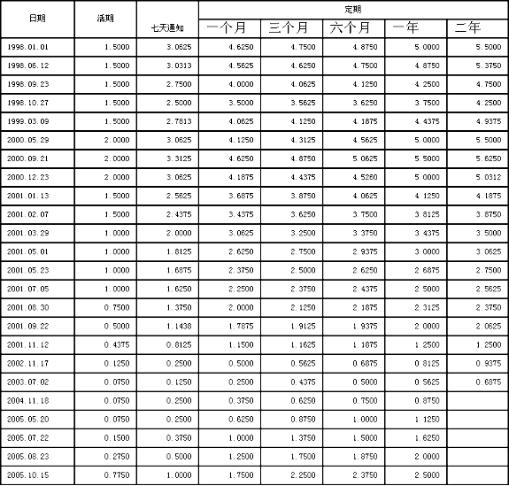 據顯示,98年以來,中國對境內美元存款利率調整了24次。10月15日,境內美元活期存款利率調整為0.7750%。定期一個月、三個月、六個月、一年利率分別調整為1.75%、2.25%、2.375%和2.5%,這次是2005年的第四次調整,比8月23日調整后的利率再次提高0.5%。