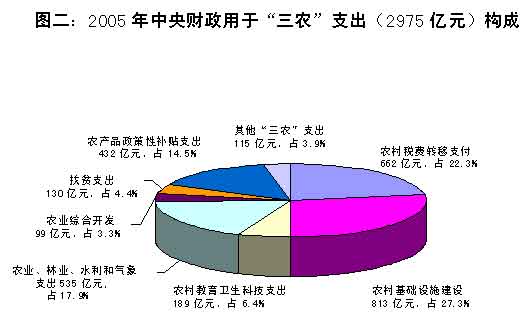 (二)大力支持解決“三農(nóng)”問題,促進(jìn)城鄉(xiāng)協(xié)調(diào)發(fā)展。2005年財政支持“三農(nóng)”繼續(xù)保持了力度大、政策實、措施強的特點。全年僅中央財政用于“三農(nóng)”的支出就達(dá)2975億元,比2004年實際執(zhí)行數(shù)增加349億元,增長13.3%。一是不斷深化農(nóng)村稅費改革。中央財政為此轉(zhuǎn)移支付662億元,比2004年增長26.3%。2005年,牧業(yè)稅和除煙葉外的農(nóng)業(yè)特產(chǎn)稅已全部免征;免征農(nóng)業(yè)稅的省份達(dá)到28個,8億農(nóng)民受益。二是認(rèn)真落實“三補貼”等政策。全國30個省份用于糧食直補的資金達(dá)到132億元,比2004年增長13.8%。兌付良種補貼資金38.7億元,比2004年增長35.8%。中央財政兌付農(nóng)機具購置補貼資金3億元,是2004年的4倍多。另外,落實專項資金55億元,對產(chǎn)糧大縣予以財力補助;對企業(yè)生產(chǎn)銷售的尿素免征增值稅,運用關(guān)稅政策鼓勵進(jìn)口國內(nèi)短缺的農(nóng)業(yè)生產(chǎn)資料。調(diào)動了地方政府重農(nóng)抓糧的積極性,維護(hù)了糧食安全。三是支持農(nóng)業(yè)和農(nóng)民長遠(yuǎn)發(fā)展。2005年中央財政用于農(nóng)業(yè)農(nóng)村基礎(chǔ)設(shè)施建設(shè)的預(yù)算內(nèi)基本建設(shè)投資和國債項目資金達(dá)812.78億元,進(jìn)一步改善了農(nóng)村生產(chǎn)生活條件。中央財政用于農(nóng)業(yè)綜合開發(fā)資金98.55億元,新增資金中76.6%用于糧食主產(chǎn)區(qū)中低產(chǎn)田改造的農(nóng)業(yè)基礎(chǔ)設(shè)施建設(shè)。同時,積極探索采用投資參股、專項貼息等形式,更加有效地發(fā)揮農(nóng)業(yè)綜合開發(fā)資金的引導(dǎo)、示范和帶動效應(yīng)。中央財政支持280萬農(nóng)村勞動力轉(zhuǎn)移培訓(xùn),補助資金4億元,比2004年增長60%。不斷增加用于扶貧開發(fā)方面的投入,2005年達(dá)到130億元。中央財政安排資金251.7億元,直接補貼退耕還林的農(nóng)民。繼續(xù)大力支持農(nóng)業(yè)科技推廣、農(nóng)業(yè)產(chǎn)業(yè)化、農(nóng)民專業(yè)合作組織發(fā)展、小型農(nóng)田水利建設(shè)和測土配方施肥等。