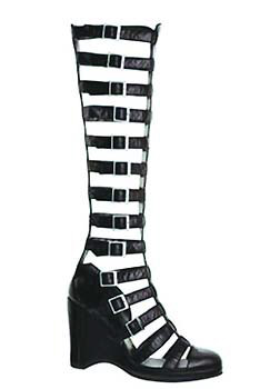 在今季的靴型涼鞋中,黑與白的配搭組成了另一條個性分明的戰線,一向品位出眾的國際品牌Chanel便是個中極品,Chanel今季推出的一款扣帶鏤空楔型靴,密密麻麻的綁帶一直蔓延到膝蓋處,金屬的扣夾加上復古的圓頭坡跟,帶有一絲浪漫中性的軍旅風格。其另一款則沿用了干練的短靴設計風格,在腳腕處柔軟的白色皮質上方,纏以簡練的黑色線條,黑與白的完美配搭帶一點后現代的前衛感覺。
