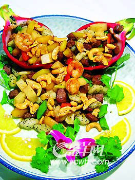 原料:火龍果1個:鮮蝦仁50克、鮮牛柳100克、腰果、四季豆、黃椒、蔥、姜各少量、鮮檸檬片4片