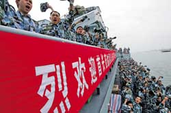 軍艦解纜離港的瞬間,列隊右甲板的官兵中間,突然爆發出一陣陣豪邁而又深情的呼喊:“戰友再見!親人再見!”喊聲如驚雷,滾過大海,躍上云霄,震撼心扉,令人動容。