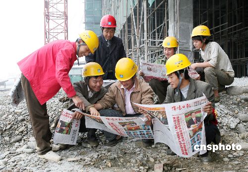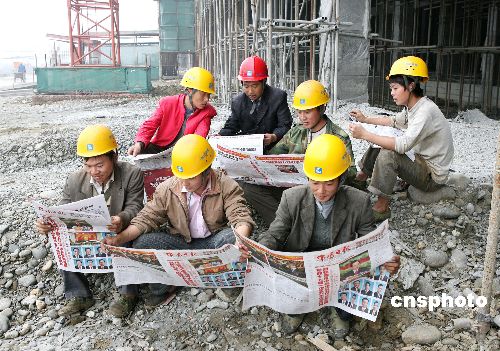 10月23日上午,綿陽長虹工業園虹歐PDP項目建筑工地,中建公司的農民工在閱看《綿陽日報》有關十七大的報道。他們看到十七大報告中關于完善和落實國家對農民工的政策,依法維護勞動者權益等內容后喜笑顏開,表示將安全生產,把工程項目盡快完成,為祖國建設貢獻自己的力量。中新社發 蒲滔 攝