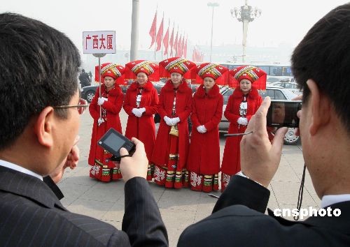 三月十日,十一屆全國人大一次會議在北京舉行第三次全體大會,會議結束后,代表委員忙著抓拍美麗瞬間。中新社發(fā) 任海霞 攝