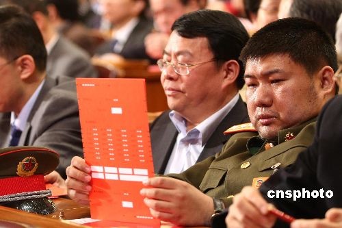 3月13日下午,全國政協十一屆一次會議在北京人民大會堂舉行第四次全體會議,選舉賈慶林為新一屆政協主席,王剛等二十五人為副主席,錢運錄兼任秘書長,同時選舉產生二百九十八名政協常委。圖為毛澤東之孫毛新宇委員(右)在投票前細覽選票。中新社發(fā) 盛佳鵬 攝