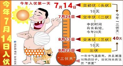 頭伏餃子二伏面,三伏烙餅攤雞蛋。7月14日是今年的入伏日。氣象專家介紹,今年入伏日在7月14日,“頭伏”長10天;7月24日入“中伏”,二伏有20天;8月13日入“末伏”,三伏有10天,整個“三伏天”達40天。