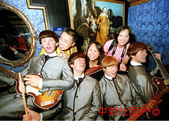 披頭士樂隊的樂迷與逼真的蠟像合影留念