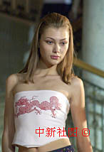 一名到北京參加大都會世界超級模特大賽的俄羅斯少女,日前晚會上身著龍紋胸圍向新聞界亮相。中新社記者 賈國榮 攝