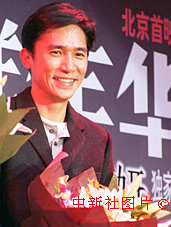 在53屆戛納電影節上榮獲兩項大獎的中國經典影片《花樣年華》,二十四日晚在北京嘉里中心飯店舉行首映式,影片中男主角扮演者,著名影星梁朝偉出席了首映式。中新社記者 錢興強 攝