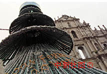 澳門大三巴牌坊前擺放出一棵高大的圣誕樹,為回歸一周年紀念前的澳門增添了歡樂的氣氛。中新社記者 滿會喬 攝
