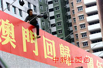澳門很多建筑物懸掛起回歸一周年慶祝標(biāo)語