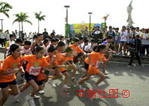 澳門回歸一周年到來之際,澳門中華總商會青年委員會十七日舉行一系列慶祝活動,圖為在觀音像前舉辦的環湖長跑比賽。中新社傳真 宗金柱攝
