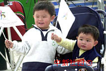 弟十六日隨家長(zhǎng)參加慶祝回歸一周年的活動(dòng)時(shí),揮舞支持北京申辦奧運(yùn)會(huì)的小旗。中新社傳真 宗金柱攝