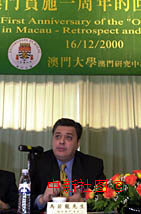 慶祝回歸一周年,澳門大學十六日舉行“一國兩制在澳門實踐一周年的回顧與前瞻”研討會,圖為土生葡人社團“根在澳門”主席馬若龍在會上發言。中新社傳真 宗金柱攝