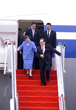 國家主席江澤民和夫人王冶坪19日下午乘專機(jī)抵達(dá)澳門機(jī)場,出席澳門回歸祖國一周年慶典活動。中新社傳真 滿會喬攝