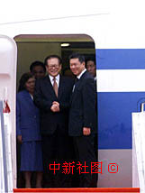 (握手)首次進京述職的澳門特別行政長官何厚鏵陪同國家主席江澤民乘專機19日抵達澳門。中新社傳真 滿會喬攝