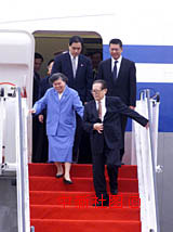 何厚鏵陪江澤民與王冶坪下機.國家主席江澤民與夫人王冶坪在澳門特區行政長官何厚鏵的陪同下,于19日下午乘專機抵達澳門機場,出席澳門回歸祖國一周年慶典活動,江澤民主要陪同人員錢其琛等同機抵達。中新社傳真 滿會喬攝
