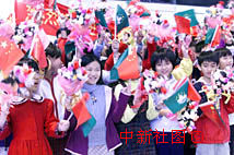 國家主席江澤民和夫人王冶坪19日下午乘專機抵達澳門機場。150名小朋友手舉國旗、區旗和鮮花在機場歡迎江澤民主席和夫人抵達澳門。中新社傳真 滿會喬攝