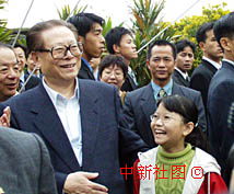 國家主席江澤民20日下午在大炮臺參觀時與澳門小姑娘丘芷慧親切交談。中新社傳真 董會峰 攝