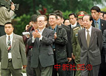 國家主席江澤民、國務院副總理錢其琛、澳門特別行政區行政長官何厚鏵20日下午參觀澳門大炮臺時,聽到游客問候后高興回應。中新社傳真 滿會喬 攝