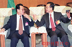 全國政協主席李瑞環(左)與溫家寶副總理九日出席九屆全國政協三次會議全體大會前親切交談。作者:宗金柱