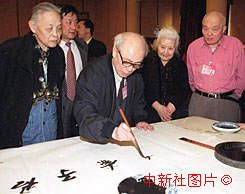 全國政協委員與北京書畫家九日在政協禮堂舉行書畫聯誼會,著名書法家、北師大教授歐陽中石委員即興揮毫。作者:羅仰明
