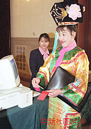 被人們親切稱(chēng)呼為“兩會(huì)”“格格”的遼寧滿族代表祈雅民,十日來(lái)到大會(huì)堂,插卡報(bào)到出席全國(guó)人大會(huì)議。作者:陳勇