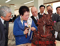 在京參加全國政協九屆三次會議的部分政協委員十一日參觀由香港企業家陳麗華女士出資數億元人民幣興建的中國紫檀博物館。陳麗華女士向委員們介紹紫檀雕刻工藝。作者:宗金柱