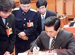 國家副主席胡錦濤十一日在出席九屆全國人大三次會議主席團第二次會議時,為人大代表們在首日封上簽字。作者:李剛