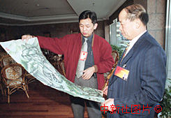 八十高齡的北京宮廷畫派代表人吉文旭(滿族),十二日委托工作人員向出席九屆全國人大三次會議的全國人大常委梁廣大(右)贈送國畫。作者:陳勇
