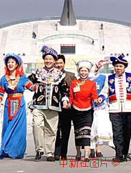 來自壯鄉廣西的全國人大代表十二日籍大會休息之機,興致勃勃地游覽中國迎接二千年的標志性建筑——中華世紀壇。作者:周群