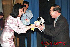 出席九屆全國人大三次會議的臺灣省代表張永鈞(右)十一日晚在部分人大代表的聯歡會上唱閩南歌曲大受歡迎。作者:羅仰明