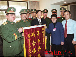 全國政協委員遲寶榮(右二)與負責接待出席會議部分政協委員的北京大觀園酒店副總經理董利華十二日向武警北京總隊十三支隊官兵贈送錦旗,感謝他們為保衛“兩會”順利舉行做出的貢獻。作者:李剛
