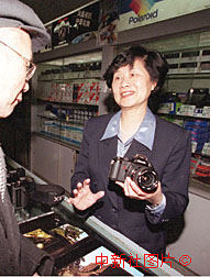 全國人大代表、鳳凰光學(xué)股份有限公司副總經(jīng)理嚴(yán)志峻(右)十三日利用會議間隙到北京鳳凰相機專柜站柜臺,向顧客介紹鳳凰新產(chǎn)品。作者:王麗南