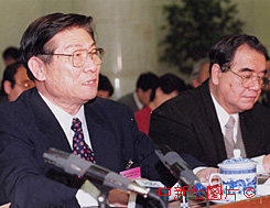 中國地質大學校長趙鵬大(左)四日在全國政協教育界聯組會上說:西部開發應不惜一切代價引進高新技術和拔尖人才,實現創新型和跨越式發展。作者:羅仰明