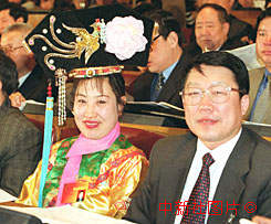來自遼寧省的人大代表祈雅民(滿族)穿戴民族節(jié)日盛裝出席九屆全國人大三次會議開幕大會。作者:李剛