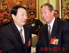 朱镕基總理七日到全國人大甘肅代表團參加討論會時,與來自酒泉地區的代表陳學亨交談。作者:彭偉翔