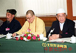 全國政協委員、中國伊斯蘭協會顧問馬賢(右一)八日在全國政協宗教界討論會上,就西部開發等問題發表了意見。作者:羅仰明