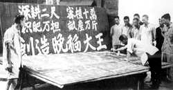 圖文:雞公山水稻畝產四萬八真相 2000年6月13日 16:36 ![]() 安徽省樅陽縣一塊號稱畝產1·6萬斤的 “衛星田”。田里的稻子是從各地移來的 ![]() 大躍進中,農民表決心。照片據《圖片中國百年史》 張勝林(河南信陽) 1958年9月1日,信陽縣雞公山人民公社新集大隊放出河南省水稻畝產特大“衛星”:6畝6分3厘干部水 稻試驗田總產324375·5斤,平均畝產48925·7斤。這顆大“衛星”升天后,新華社隨即發了消息,轟動全國。 全省各級領導親臨參觀和總結經驗,9月9日《河南日報》第二版以“雞公山上紅旗插,水稻畝產四萬八”的醒目標題,對大 “衛星”的組織施放作了詳細報道。 這個被大躍進狂風吹起來的水稻“衛星”,雖在當時被歌頌為信陽人民農業大躍進的偉大創舉,卻留下了一個謎 :照“衛星”田里的水稻總產量計算,那么,這塊“衛星”田平均每平方米就得產出稻谷73斤。然而,73斤稻谷就是放在 一平方米的空地里,也要堆出一定高度,何況稻谷結在稻穗上,直徑3毫米左右的稻莖又如何承受得了呢? 為了解開這個謎,我們對當年目睹現場的一些同志進行了反復調查訪問。在調訪過程中,這些同志不僅幫助我們 弄清了雞公山水稻畝產“四萬八”的真相,而且訴說了雞公山人民當年吞下這個苦果的難言之苦。 信陽縣越改越大的躍進規劃 1957年,信陽縣和全國一樣,勝利實現和超額完成了國民經濟第一個5年計劃,各條戰線出現了蓬勃發展的 局面。然而,由于從上到下對成績的宣傳夸張,使一些干部的頭腦發熱,在指導方針上出現了急于求成的“左”的冒進。19 58年2月26日,中共信陽縣委召開擴大會議,制定并通過了《信陽縣全面躍進20條規劃》,號召和動員全縣人民投入到 大躍進的洪流之中。 1958年5月,黨的八大二次會議通過總路線:“鼓足干勁,力爭上游,多快好省地建設社會主義”,在信陽 縣宣傳貫徹后,信陽掀起了大躍進的高潮。同月底,中共信陽縣委、縣人委對《信陽縣全面躍進20條規劃》進行了補充修改 ,把1958年全縣糧食總產量從原規劃的8·5億斤提高到“保證實現14億斤,爭取18億斤”(這樣驚人的數字,信陽 縣不僅當年沒有實現,就是時隔30多年后農業年景比較好的1996年,全縣糧食總產量也才達到9·5億斤,為1958 年規劃14億斤的67·8%)。同時,中共信陽縣委還提出“十年規劃,一年實現”的躍進口號。 外地衛星的刺激 1958年6月,廣東省早稻畝產82525斤和河南省西平縣小麥畝產7320斤,這兩顆“衛星”消息傳到 信陽縣后,信陽縣感到鼓舞和震動。7月5日,中共信陽縣委召開擴大會議,縣委提出:“必須認識到今年是農業生產大躍進 的一年,不是要求增產幾成的問題,而是要翻幾番。因此,必須鼓足干勁,爭取更大勝利”。為了放出信陽縣的農業高產“衛 星”,縣委要求“樹立敢想、敢說、敢作、敢為的前進思想,從而解放思想,破除迷信”。 7月,全國宣傳貫徹毛澤東主席關于把工、農、商、學、兵組成為一個大公社的指示,信陽縣聞風而動,在全信 陽地區率先建立人民公社。7月22日,中共信陽縣委在雞公山召開擴大會議,決定撤銷全縣32個鄉、鎮及一個辦事處,成 立12個人民公社。縣委要求,各公社要借人民公社化的東風,更好組織農業生產大躍進,并示意試辦農業“衛星”田塊。 縣委擴大會議結束后,各公社開始籌劃具有本地特色的農業“衛星”,棉花、玉米、紅薯等都被列入“衛星”計 劃之列。 雞公山準備水稻“衛星” 在籌劃“衛星”時,地處豫鄂交界的雞公山人民公社黨委提出,淮河北的西平縣能放出小麥畝產七千三的全國大 “衛星”,我們淮河南的雞公山為何不能利用我們盛產水稻的優勢,放出水稻高產“衛星”?只要有雄心,思想再解放,“ 衛星”定能升天。為了選準“衛星”的試點,公社黨委曾幾次召開會議研究,最終選擇新集大隊的一塊6畝6分3厘干部試驗 田作為“衛星”點。 這塊試驗田在5月5日秧苗移栽時,采用了3×3(行距、株距各3寸)的密植法,加之向這塊試驗田投放的肥 料較多,公社黨委因之認為,這為我們秋收放“衛星”奠定了基礎(經過實踐證明,3×3的密植法是一種違反科學的技術躍 進,它不僅破壞了光合作用,而且也不利于農田管理,但3×3的密植法當時卻作為農業現代化在全縣推廣)。 “調兵借將” 8月下旬,水稻已經基本成熟,臨近收割。雞公山公社黨委于8月下旬連續開會,研究如何放出水稻高產“衛星 ”。公社黨委認為,能否成功放出水稻高產 “衛星”,不僅取決于黨委的信心,而且也取決于黨委一班人的統一認識和統一 口徑(所謂統一認識、統一口徑,就是要求黨委每個成員不要對放水稻高產“衛星”持任何懷疑態度,“衛星升天”是全社人 民的驕傲,也是全縣人民的光榮);而且在向上級匯報中,不準說三道四。這成為雞公山黨委在組織施放水稻高產 “衛星” 中的一條嚴明政治紀律。 放水稻高產“衛星”,必須要內定一個標準,經過黨委研究確定,試驗田里的水稻畝產量不低于45000斤。 這6畝多試驗田,到底能產多少斤水稻,社、隊干部以及試驗田的管理人員心里最清楚。但為了放出水稻高產“ 衛星”,不得不采取“調兵借將”之計。 8月28日晚,雞公山公社黨委在新集大隊召開放水稻高產“衛星”動員大會。黨委要求:參加放“衛星”的所 有社員,要統一組織,所有放“衛星”的行動要聽從社、隊干部的指揮,不該問的絕對不準問,不該講的絕對不準講,如有說 三道四