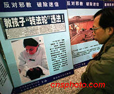 以“反對邪教、維護穩定、崇尚科學、傳播文明”為主題的“青年文明社區反邪教行動”,二月在北京市全面啟動,揭批“法輪功”的圖片展在北京圖書大廈吸引讀者觀看。中新社圖 陸云 攝