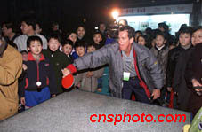 國際奧委會評估團(tuán)二十二日考察北京椿樹園小區(qū),澳大利亞專家西蒙與小學(xué)生玩乒乓球。中新社圖 趙彤杰 攝